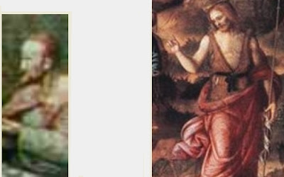 Outro dado interessante é comparar esse homem pintado no quadro de Da Vinci (que dizem ser Simão Zelote, mas na verdade é João Batista) com o João Batista pintado por Francesco Ubertini Bacchiacca II (1494-1557), pintura abaixo que esta no museu de Finas Artes em Budapeste, Romênia, onde João aparece ruivo e com uma pequena entrada na testa, exatamente como o homem pintado na tela de Da Vinci. Pouco se sabe sobre Simão Zelote. Afinal, se ele tinha essa importância reduzida ao ponto de mal ser citado nos textos bíblicos, porque justamente ele, junto com Jesus e Maria Madalena, canalizaria a atenção de todos os outros apóstolos no quadro de Da Vinci?